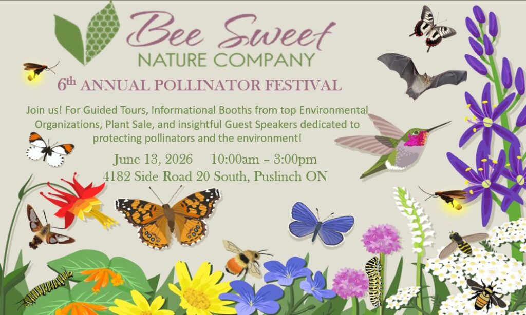 So what is this pollinator festival about? We, at Bee Sweet Nature Co, want everyone to celebrate all of our pollinators from flies, bees, butterflies, and hummingbirds to bats. They are all crucial to the health of our ecosystems and vital to a healthy food chain. It is a fun-filled day of walking tours and interaction at educational booths manned by volunteers from various environmental organizations. To support our important pollinators, we want to promote the importance of gardening with native plants that are seed-sourced from the southern Ontario landscape.