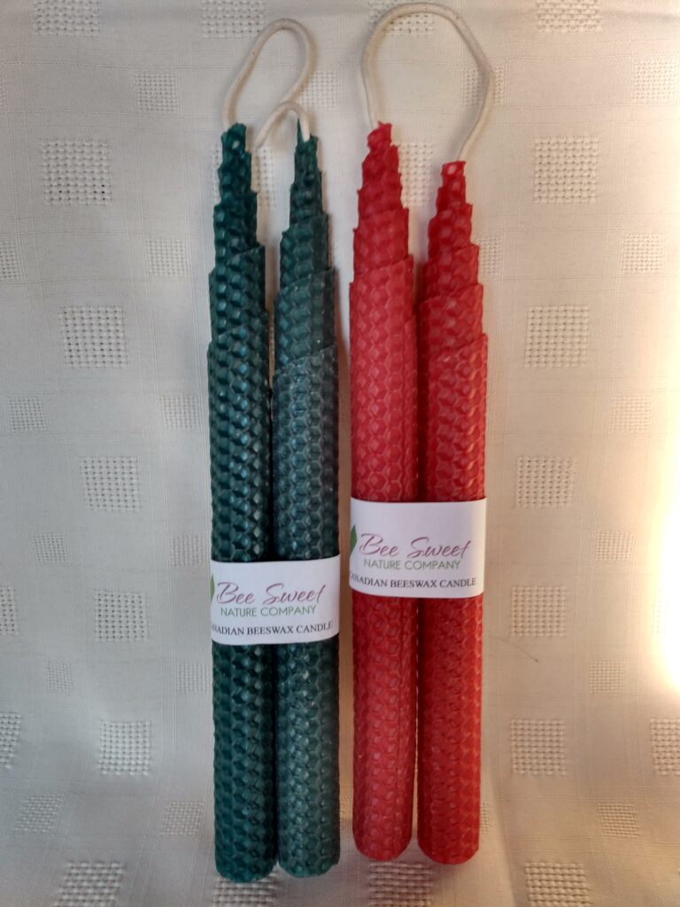Our candles, made entirely of Canadian beeswax, give off a warm glow and a pleasant sweet honey smell.